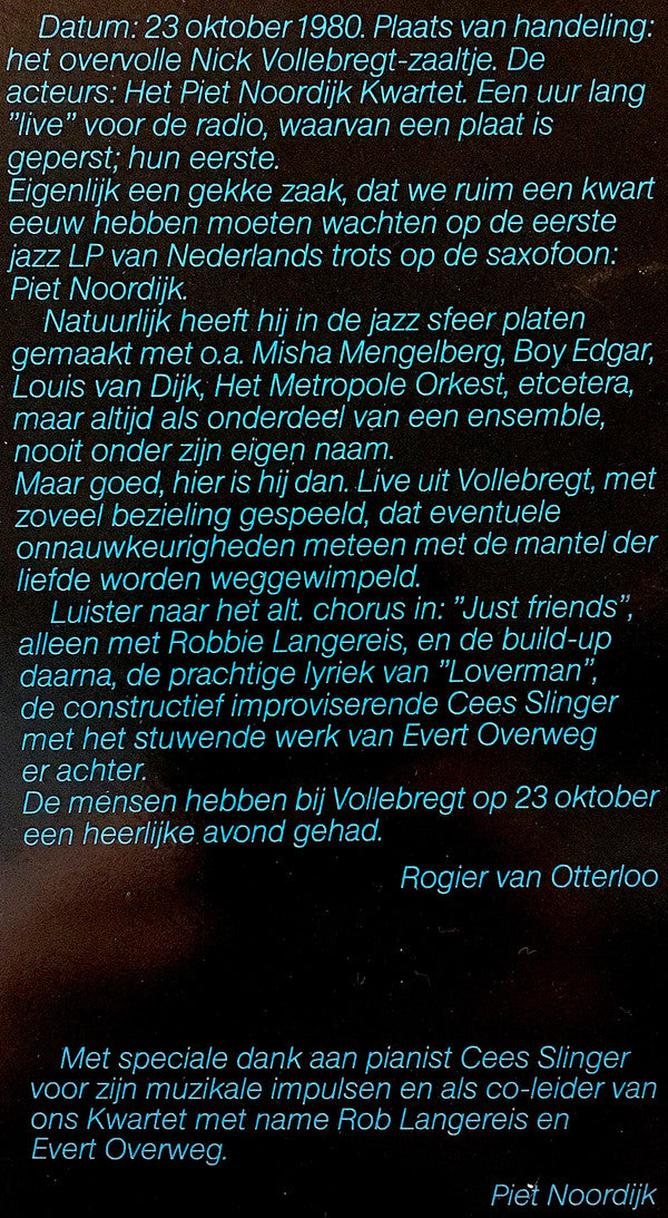 Recorded live on Thursday, 23 October 1980 at Nick Vollebregt's Jazz Café, Laren; on back cover consistently addressed as "Vollebregt".