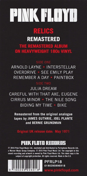 ℗ 2018 Pink Floyd Music Ltd., marketed and distributed by Parlophone Records Ltd., a Warner Music Group Company. © 2018 Pink Floyd Music Ltd. The copyright in this sound recording and artwork is owned by Pink Floyd Music Ltd. This label copy is the subject of copyright protection. All rights reserved.