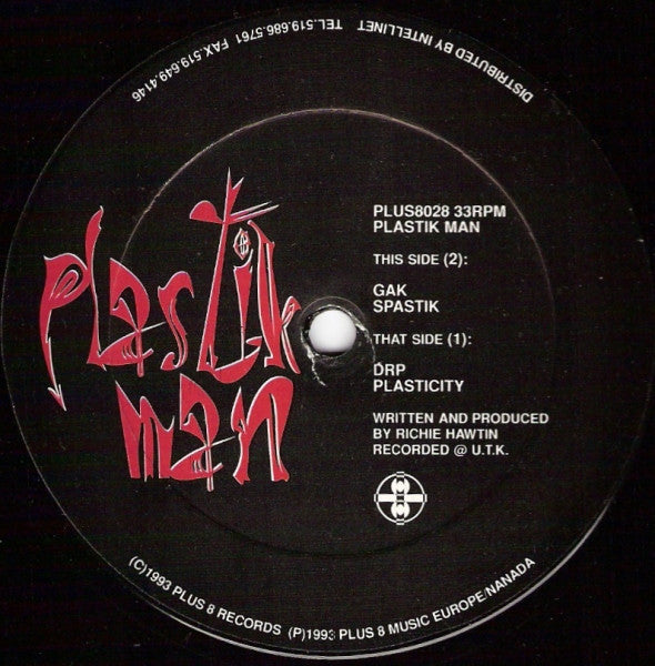 Later copies came with a big round b/w sticker of the dancing "Plastikman" in the upper right corner. Some came with a tab sheet of 400 tiny tabs with the "Plastikman" logo on the back and artist, title and label credits on the front, as well as the information "not all of these tabs are acid - but some of them are".