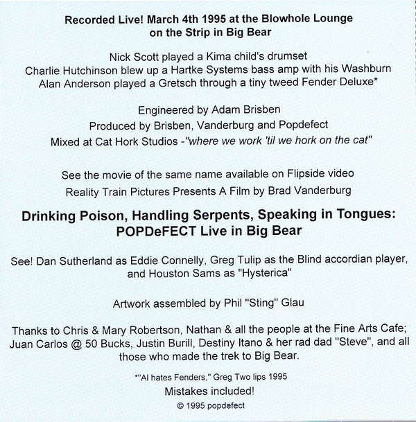 Popdefect - Drinking Poison, Handling Serpents, Speaking In Tongues: POPDeFECT Live In Big Bear (CD, Album)