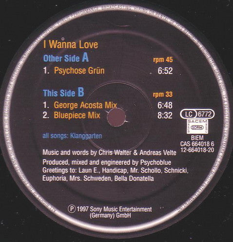 A1. I Wanna Love (Psychose Grün) 6:52 B1. I Wanna Love (George Acosta Mix) 6:48 B2. I Wanna Love (Bluepiece Mix) 8:32