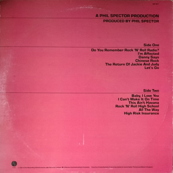 Color printed inner containing an artistic band photo with lyrics and credits on flipside. A Phil Spector Production Recorded in L.A. at Gold Star Studios, Excalibur Studios, Devonshire Sound Studios, Salty Dog Studios and Original Sound Studios On labels: (A1 to A3, A5, A6, B2 to B6) Warner Bros. Music Ltd. (A4) Chappell Music Ltd./Warner Bros. Music Ltd. (B1) Carlin Music Corp. ℗ 1980 Sire Records Company A4 is titled 'Chinese Rocks' on label. On inner sleeve: © 1980 Sire Records Company On back cover: © 1980 A Sire Recording Distributed by WEA Records Limited. A Warner Communication Company. Printed and made in England. Runouts are etched, apart from 'STRAWBERRY', which is stamped.