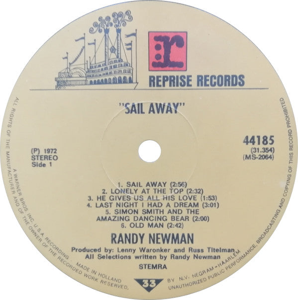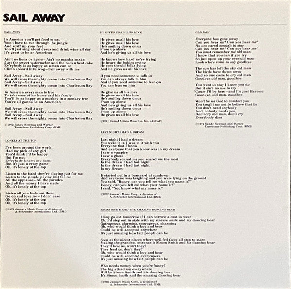 A1. Sail Away 2:56 A2. Lonely At The Top 2:32 A3. He Gives Us All His Love 1:53 A4. Last Night I Had A Dream 3:01 A5. Simon Smith And The Amazing Dancing Bear 2:00 A6. Old Man 2:42 B1. Political Science 2:00 B2. Burn On 2:33 B3. Memo To My Son 1:56 B4. Dayton, Ohio - 1903 1:47 B5. You Can Leave Your Hat On 3:18 B6. God's Song (That's Why I Love Mankind) 3:36