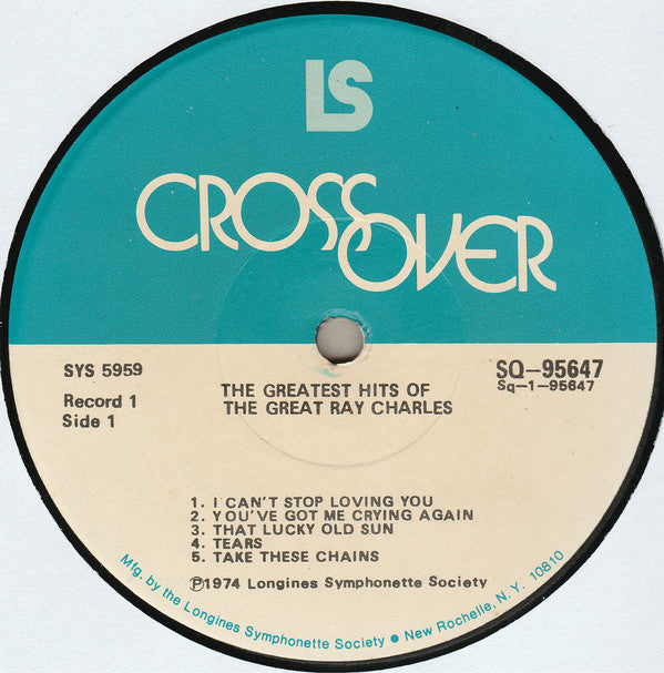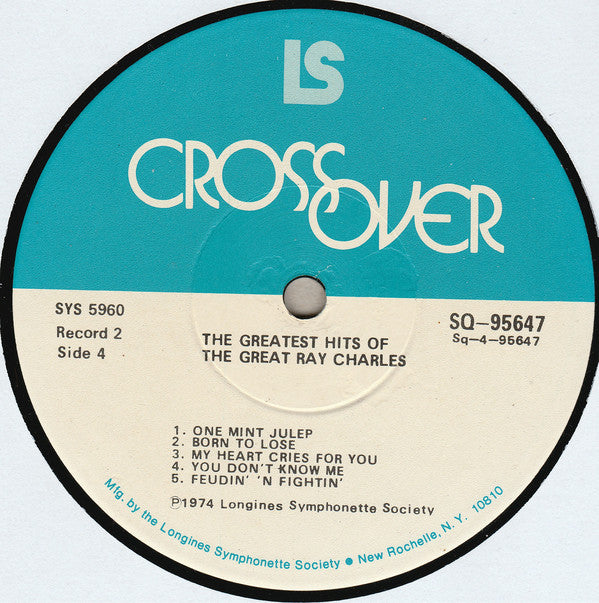 Box cover reads: "The Longines Symphonette Society Proudly Presents The Greatest Hits Of The Great Ray Charles" Blue & white labels with record # & side # on each one