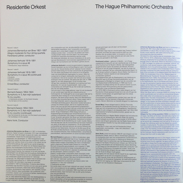 From back cover: "All the works on these two records have been taken from the record albums '400 Years of Dutch Music', Parts 1 and 2, published by The Hague Philharmonic respectively in 1979 on the occasion of its 75th anniversary, and in 1982. Album 1 contained 6 records with works by 22 different Dutch composers, while album 2 also contained 6 records with works by 21, for the most part different composers from album 1. The first album was awarded an 'Edison' in 1980, this being the highest Dutch distinction for a record and, on sales exceeding 15.000 (a figure which has in the meantime risen to around 25.000), the 'Gouden Platendoos' (Golden Record Box). After the appearance of album 2, the orchestra was awarded the commemorative medal of the Society for the History of Dutch Music."