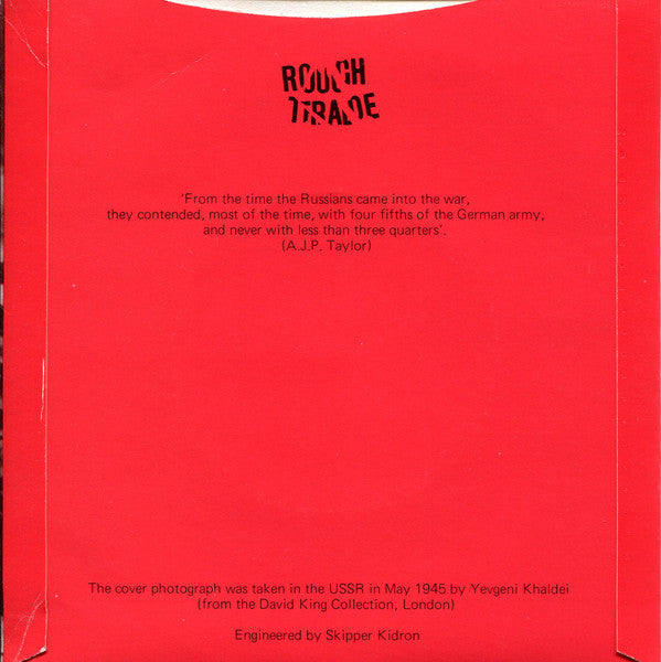 p 1980 Rough Trade Back cover quote: 'From the time the Russians came into the war, they contended, most of the time, with four fifths of the German Army, and never with less than three quarters'. (A.J.P. Taylor) The cover photograph was taken in the USSR in May 1945 by Yevgeni Khaldei (from the David King Collection, London)