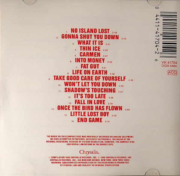 1. No Island Lost 3:482. Gonna Shut You Down 3:033. What It Is 3:214. Thin Ice 3:405. Carmen 3:376. Into Money 2:537. Fat Gut 3:218. Life On Earth 3:389. Take Good Care Of Yourself 4:4610. Won't Let You Down 4:2211. Shadow's Touching 4:2712. It's Too Late 3:3813. Fall In Love 2:3814. Once The Bird Has Flown 3:5615. Little Lost Boy 3:3016. End Game 5:10