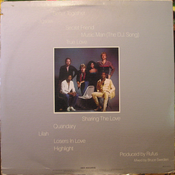 On front cover 'Rufus' is embossed. Glossy photo in the centre of rear cover. On spine: ★★★ "Highlight" recorded at The Record Plant, Los Angeles Mastered at Allen Zentz Mastering Recorded at Allen Zentz Studio, Hollywood, California © 1981 MCA Records, Inc. ℗ 1981 MCA Records, Inc. Printed cardboard inner sleeve with lyrics and credits. Some copies have been found with one blank label (see image). Also released with slightly different labels.