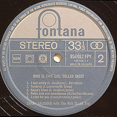 Recorded live at the Tivoli Theatre, Copenhagen, Denmark. Recordings of the first time Sarah Vaughan played in Denmark: "Sarah was a little doubtful about what the reaction would be. She found out after the very first number. They loved her and she got freer and freer with each tune. That's probably the reason Sarah's so open on these performances." Made in Holland Late 60s reissue of the album 'Sassy Swings The Tivoli'