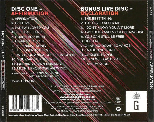 Bonus disc "Declaration" recorded live at The Brisbane Entertainment Center, 20th and 21st May 2000 as part of the "Affirmation World Tour".