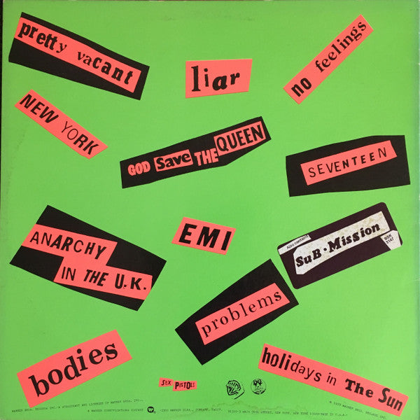 - Black and white 'Sex Pistols' labels with smaller WB and Virgin logos at top of labels, instead of the standard Warner Bros labels used later.