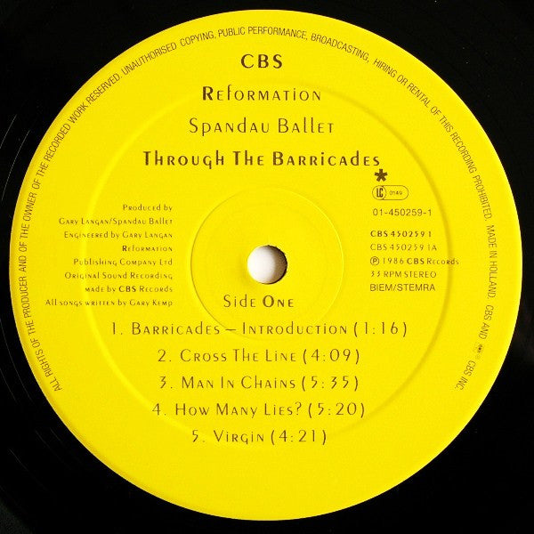 Distribution CBS Records/CBS Disques S.A. ℗ 1986 CBS Records/© 1986 CBS Records Made & Printed in Holland Some copies carry a yellow circled sticker: "Includes Fight For Ourselves Through The Barricades 450259 1"