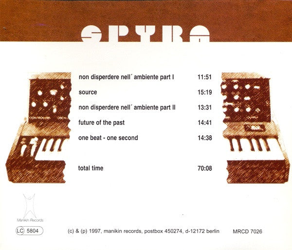 All tracks are composed, arranged and recorded by Spyra at Phön-Studio/Kassel, except the tracks Source and One Beat – One Second, which were recorded during a studio rehearsal in Cologne (many thanks to Bernd Friedmann)."