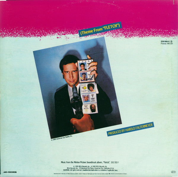 Top opening spineless sleeve Music from the Motion Picture Soundtrack album, "Fletch," 252 332-1 Original version appears on the MCA LP, 252 332-1, music from the motion picture "Fletch". MCA Music, a division of MCA, Inc./Kilauea Music/Rightsong Music, Inc./Franne Golde Music Manufactured in Germany by Record Service GmbH, Alsdorf · Pressé en Allemagne par Record Service GmbH, Alsdorf Label rim text: Made in Germany by WEA Musik GmbH A Warner Communications company Back cover image © 1985 Universal City Studios, Inc. © 1985 MCA Records, Inc. ℗ 1985 MCA Records, Inc.