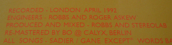 Recorded - London April 1992 Re-mastered [... @ Calyx, Berlin Published by Complete Music / Domino Publ. Co. Ltd Original sound recording made by Too Pure, London ℗ & © 1992 Too Pure Includes a double-sided insert with lyrics and liner notes discussing the album.