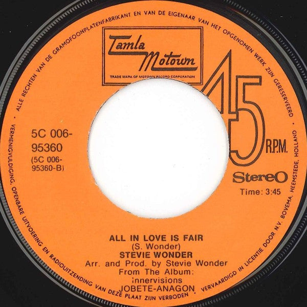 Vervaardigd in Licentie door N.V. Bovema, Heemstede, Holland From The Album: Innervisions 5C 056-94665