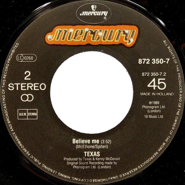 On labels: Made in Holland ℗1989 Phonogram Ltd. (London) Original Sound Recording made by Phonogram Ltd. (London) On backsleeve: Phonogram ℗ 1989 Phonogram Ltd. (London) © 1989 Phonogram Ltd. (London) Picture sleeve is textured