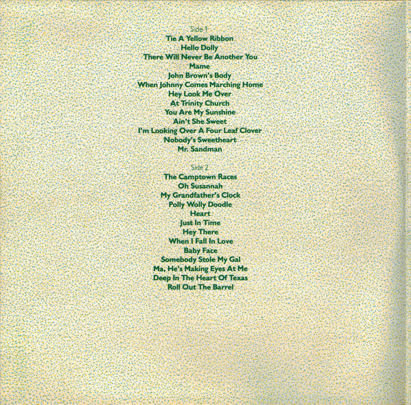 A1.4. Mame A2.1. John Brown's Body A2.2. When Johnny Comes Marching Home A2.3. Hey Look Me Over A2.4. At Trinity Church A3.1. You Are My Sunshine A3.2. Ain't She Sweet A3.3. I'm Looking Over A Four Leaf Clover A3.4. Nobody's Sweetheart A3.5. Mr. Sandman B1.1. The Camptown Races B1.2. Oh Susannah B1.3. My Grandfather's Clock B1.4. Polly Wolly Doodle B2.1. Heart B2.2. Just In Time B2.3. Hey There B2.4. When I Fall In Love B3.1. Baby Face B3.2. Somebody Stole My Gal B3.3. Ma, He's Making Eyes At Me B3.4. Deep In The Heart Of Texas B3.5. Roll Out The Barrel C1.1. My Old Kentucky Home C1.2. Poor Old Joe C1.3. I Dream Of Jeannie With The Light Brown Hair C1.4. The Old Folks At Home C2.1. The Old Rustic Bridge By The Mill C2.2. Beautiful Dreamer C2.3. Falling In Love With Love C2.4. I Live In Trafalgar Square C3.1. You're Nobody 'til Somebody Loves You C3.2. I'm Gonna Sit Right Down And Write Myself A Letter C3.3. Friends And Neighbours C3.4. Bring Me Sunshine D1.1. He's Got The Whole World In His Hands D1.2. Standing On The Corner D1.3. Swinging On A Star D1.4. Side By Side D2.1. Just Walkin In The Rain D2.2. My Happiness D2.3. Till D2.4. Sam's Song D3.1. People D3.2. When You're Smiling D3.3. For Me And My Gal D3.4. The Party's Over