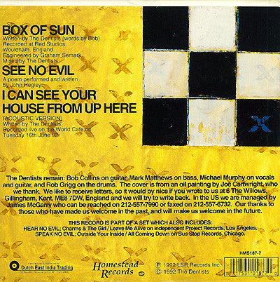 This record is part of a trilogy by The Dentists on different labels where each release includes a poem written and performed by John Hegley.