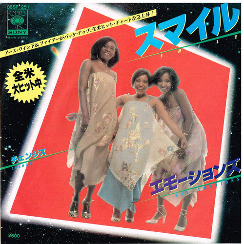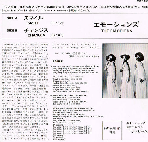 Japanese version of the Emotions (エモーションズ in Japanese ) single, "Smile/Changes." The insert sleeve/front has a multi-color full-length photo. The insert sleeve/back has biographical information in Japanese and the lyrics for "Smile" in English.