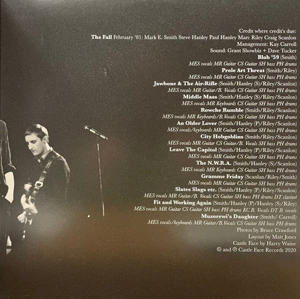 2023 black vinyl repress with four postcards signed by Paul Hanley, Steve Hanley, Marc Riley and Craig Scanlon. Set includes 12" and 7" records in a gatefold sleeve. 7" sits in a pocket on the inside of the gatefold. Both gatefold and 7" sleeves are printed black inside, and the vinyl is housed in printed black paper inner sleeves. Released in a resealable plastic bag containing the four postcards, with the black vinyl LP shrinkwrapped inside.