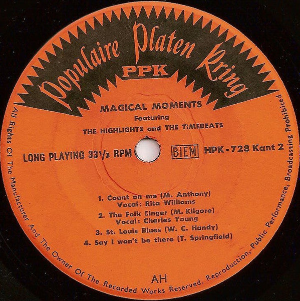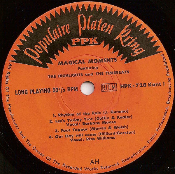 Backside cover of sleeve says (originally in Dutch) that: "The Highlights" is an English vocal group lead by Rita Williams. "The Timebeats" are a group of English instrumentalists brought together especially for this record in support of The Highlights.
