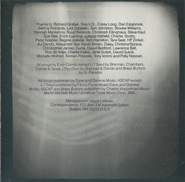 All songs published by Dave and Darlene Music, ASCAP except Li'l Seed published by Fancy Pants Music/Dave and Darlene Music, ASCAP and Brass Buttons published by Charles Koppelman Music/Martin Bandier Music/Jonathan Three Music Corp., BMI