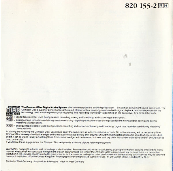 CD is manufactured by PolyGram in Hanover, West Germany. (Sleeve)