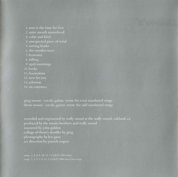 1. Now Is The Time For Love 2. MInt Mouth Motorhead 3. Color And Kind 4. Unexpected Gusts Of Wind 5. Sorting Books 6. The Wooden Tears 7. Bentonia 8. Falling 9. April Mornings 10. Becky 11. Fascination 12. New For You 13. Schwinn 14. On Extremes