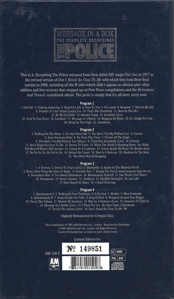 4-CD Digibook containing a 68-page 5"x10" booklet with liner notes, pictures and credits Back cover: Digitally remastered for compact disc This Compilation: ℗ 1993 A&M Records Ltd., London. ©1993 A&M Records Ltd., London. Discs: Manufactured in Germany Booklet: Mastered at A&M Mastering Studio, August 1993. Packaging printed and manufactured by CMCS Print & Packaging, London, England. Published 1993 by A&M Records Ltd. This book © 1993 A&M Records Ltd. Tracks 1-14, 1-15 produced in conjunction with WNEW-FM New York. Tracks 1-1 and 1-2 ℗ 1977 Illegal Records Tracks 1-3 to 1-13 ℗ 1978 A&M Records Ltd. Tracks 1-14 to 2-7 and 2-9 ℗ 1979 A&M Records Ltd. Tracks 2-8 and 2-10 to 3-1 ℗ 1980 A&M Records Ltd. Tracks 3-2 to 3-16 ℗ 1981 A&M Records Ltd. Tracks 3-17 and 3-18 ℗ 1982 A&M Records Ltd. Tracks 4-1 to 4-13 ℗ 1983 A&M Records Ltd. Tracks 4-14 and 4-15 ℗ 1982 A&M Records Ltd. Track 4-17 ℗ 1984 A&M Records Ltd. Track 4-18 ℗ 1986 A&M Records Ltd. Track 4-18: Title simply given as "Don't Stand So Close To Me '86" on release. All tracks published by Magnetic Publishing Ltd. except: Tracks 1-1, 1-2 published by Island Music Ltd. Track 1-3 published by Magnetic Publishing Ltd./ Island Music Ltd./ Virgin Music (Publishers) Ltd. Track 1-12 published by Rondor Music (London) Ltd./ Magnetic Publishing Ltd. Tracks 1-14, 1-16 published by Magnetic Publishing Ltd./ Island Music Ltd.