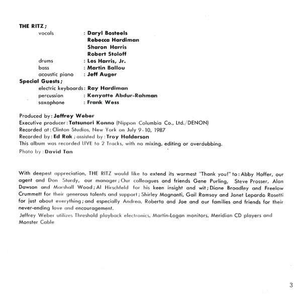 Digital recorded live to 2 tracks, with no mixing, editing or overdubbing, at Clinton Studios, New York on July 9 & 10, 1987.