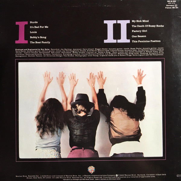 A1. Nurds 4:13 A2. It's Bad For Me 2:43 A3. Louis 3:32 A4. Bobby's Song 3:15 A5. The Boat Family 3:21 B1. My Sick Mind 4:04 B2. The Death Of Suzzy Roche 2:59 B3. Factory Girl 4:45 B4. One Season 4:40 B5. This Feminine Position 3:58