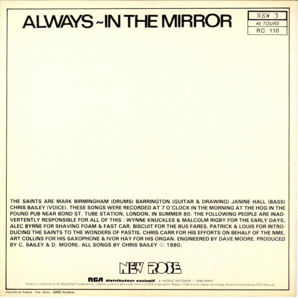 Made in France Glossy cover Recorded at 7 o'clock in the morning at the Hog in the pound pub near Bond St. Tube Station, London, in Summer 80. © 1980 ℗ 1980 "RCA distributeur exclusif"