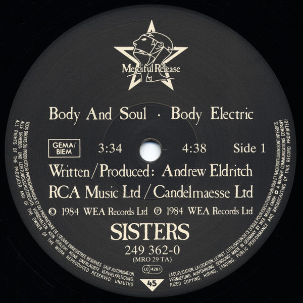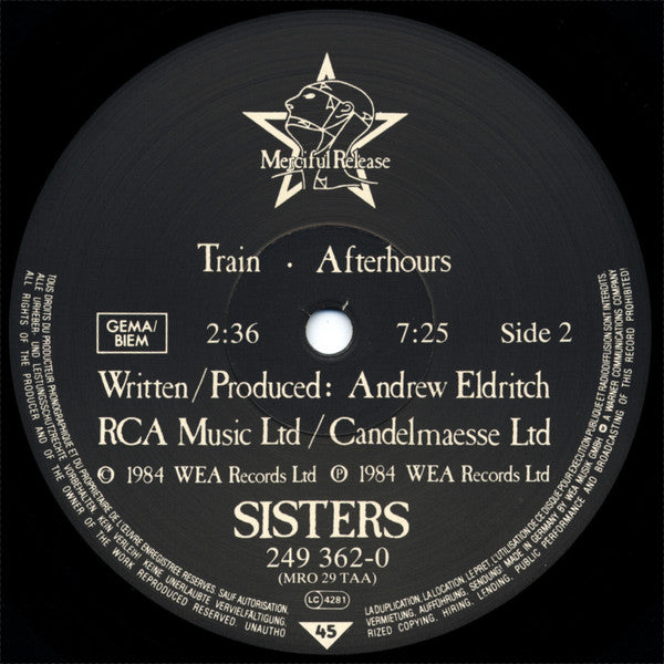 1st pressing comes in 'thin', matte sleeve. Labels: RCA Music Ltd / Candelmaesse Ltd ℗ 1984 WEA Records Ltd. © 1984 WEA Records Ltd. Back sleeve: Merciful Release/WEA ℗ 1984 WEA Records Ltd. © 1984 A Merciful Release A Warner Communications Co. Manufactured in Germany by Record Service GmbH, Alsdorf.