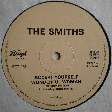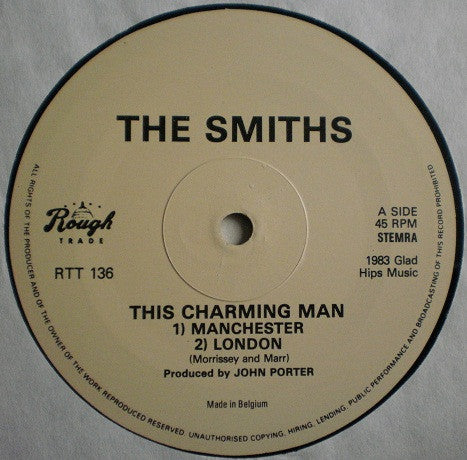 The regular Belgian "This Charming Man" 12" is numbered RTT136 on the label and 12RT.136 on the sleeve. The record is very similar to the regular UK pressing. The major differences are the tint of the label and the presence of the Megadisc logo.
