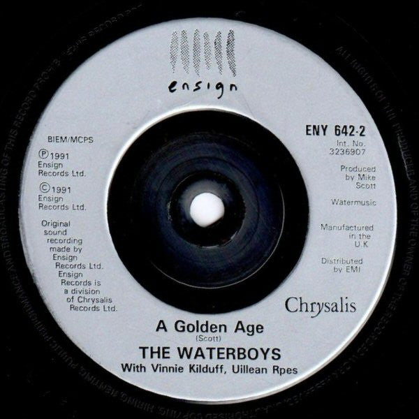Machine moulded silver labels. B side credited to "The Waterboys with Vinnie Kilduff, Uillean Rpes". In fact it should read "Uillean Pipes" which is the instrument that Kilduff plays on the song.