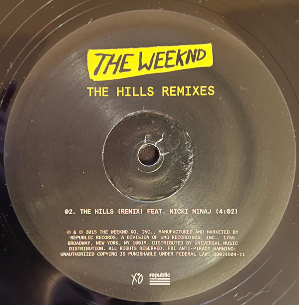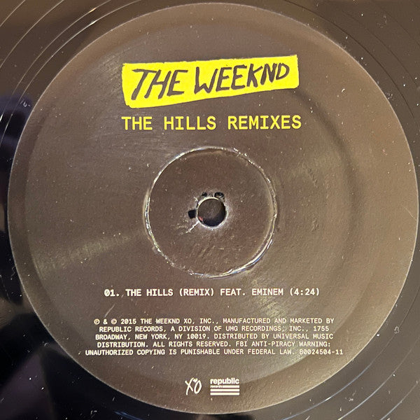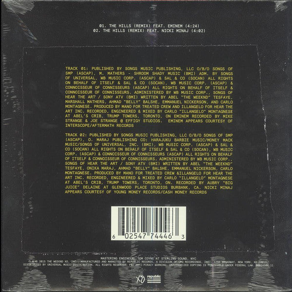 The Weeknd's Record Store Day release features remixes of the track The Hills by Eminem and Nicki Minaj. Pressed on a 12” vinyl and limited to 4,000 copies.