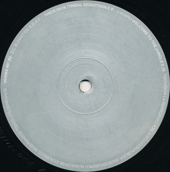 ℗ 2002 Sondos Records. © 2002 Subliminal Records. All tracks arranged and co-produced for Double Platinum Productions Inc. Published by Le Smoove Music (ASCAP)// Subpub (ASCAP). Mixed for Platinum Audio, NYC. Licensed from Subliminal Records by Blanco Y Negro Music S.A. Main artist and main title is listed as "Thick:Dick - Tribal Seduction EP" on the sleeve and as "Thick Dick - Tribal Seduction E.P." on the labels.