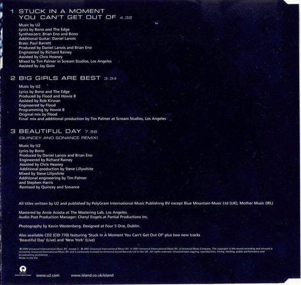 Also available CD2 (CID 770) featuring 'Stuck In A Moment You Can't Get Out Of' plus two new tracks 'Beautiful Day' (Live) and 'New York' (Live)