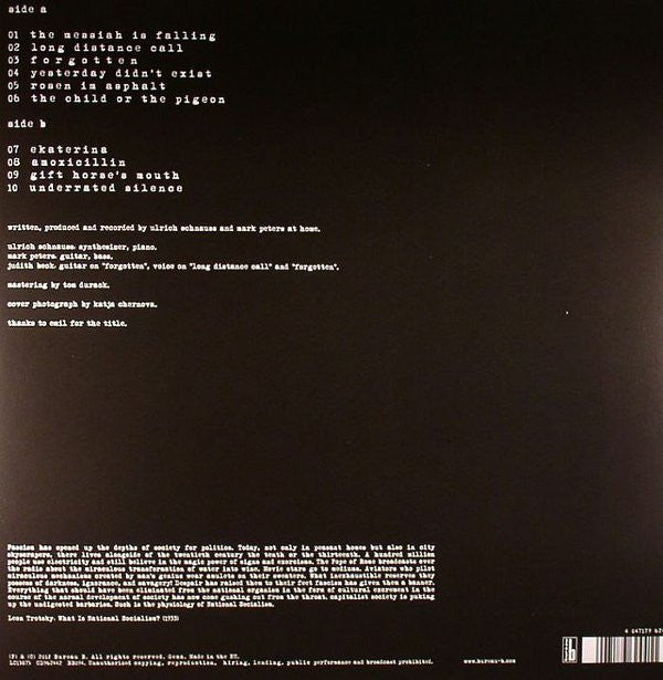 A1. The Messiah Is Falling 3:44 A2. Long Distance Call 2:53 A3. Forgotten 4:15 A4. Yesterday Didn't Exist 5:30 A5. Rosen Im Asphalt 5:35 B1. The Child Or The Pigeon 3:44 B2. Ekaterina 5:31 B3. Amoxicillin 4:20 B4. Gift Horse's Mouth 7:23 B5. Underrated Silence 6:52
