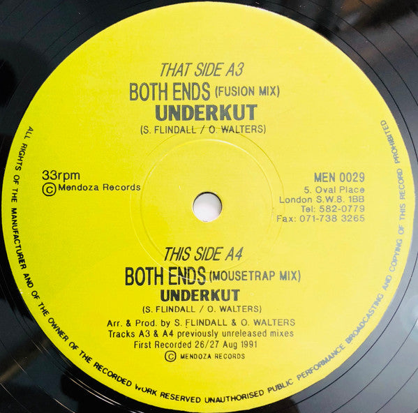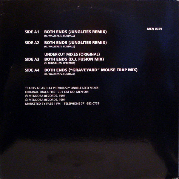 Tracks C & D Are Previously Unreleased. Catalogue number appears on the sleeve and labels as MEN 0029. Track D is listed as 'Both Ends ("Graveyard" Mouse Trap Mix)' on the sleeve but is listed as 'Both Ends (Mousetrap Mix)' on the label.