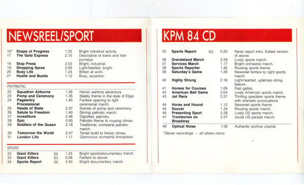 A comprehensive selection of authentic recordings capturing the mood of cinema productions of the 1930s, 40s and 50s. A companion album to KPM 81 CD Light Activity, KPM 82 CD Drama and KPM 83 CD Showbiz/Romance.