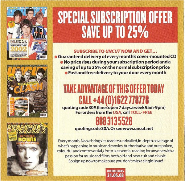 Compilation of Springsteen covers given away with the April 2003 edition of Uncut Magazine. The magazine was available with two different covers - the second featured a different CD "[r=1609957" (UNCUT 2003 04B).