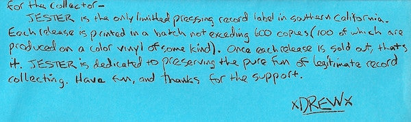 Limited to 560 copies, hand-numbered on B-side labels. Includes info sheet. 100 in clear vinyl.