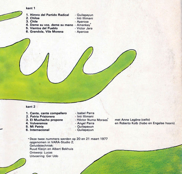 This release is the result of the cooperation between Dutch broadcasting association 'Vara', the foundation 'Vrije Muziek' (Free Music), Dutch political party 'Partij van de Arbeid' and it's Chilean sister party 'Partido Radical de Chile'. Goal was to help strengthen the international solidartity with the Chilean resistance. The netto profits of this album were to benefit the resistance work of the Partido Radical and in a broader sense to support the struggle of the leftwing Chilean parties united in the Unidad Popular.