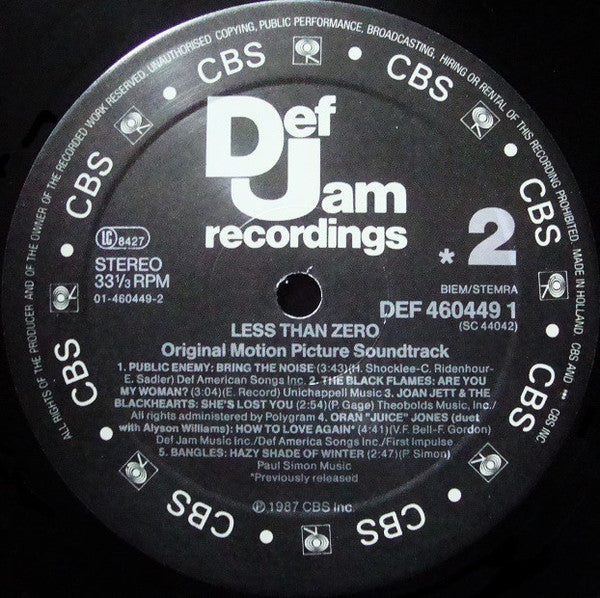 A1. Aerosmith - Rocking Pneumonia And The Boogie Woogie Flu 5:49 A2. Roy Orbison - Life Fades Away 3:41 A3. Poison (3) - Rock And Roll All Nite 3:34 A4. LL Cool J - Going Back To Cali 4:10 A5. Glenn Danzig, The Power And The Fury Orchestra - You And Me (Less Than Zero) 3:35 A6. Slayer - In-A-Gadda-Da-Vida 3:28 B1. Public Enemy - Bring The Noise 3:43 B2. The Black Flames - Are You My Woman? 3:04 B3. Joan Jett & The Blackhearts - She's Lost You 2:54 B4. Oran 'Juice' Jones, Alyson Williams - How To Love Again 4:41 B5. Bangles - Hazy Shade Of Winter 2:31