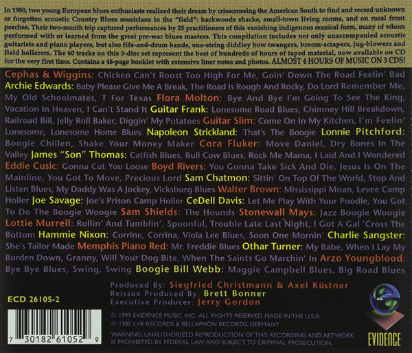 Condensed from liner notes: Recorded throughout the south on a reel-to-reel tape recorder in 1980 by two young German blues enthusiasts. Their hundreds of hours of recordings were distilled and released on a series of 14 LPs between 1981 and 1983 (L+R Records and Bellaphon Records of Germany). This 3-disc set is a selection from those LPs and the first appearance of that music on compact disc.
