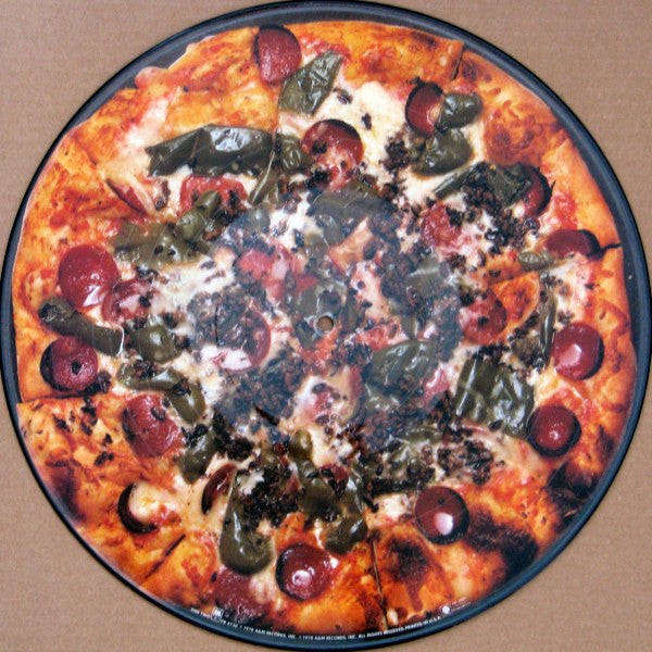 Picture disc (pizza on one side, punk "surfing" on an ironing board on the other) in a see-through plastic cover with a sticker on the front giving the title, featuring artists and catalogue number. Sticker on the other side gives the track listing.