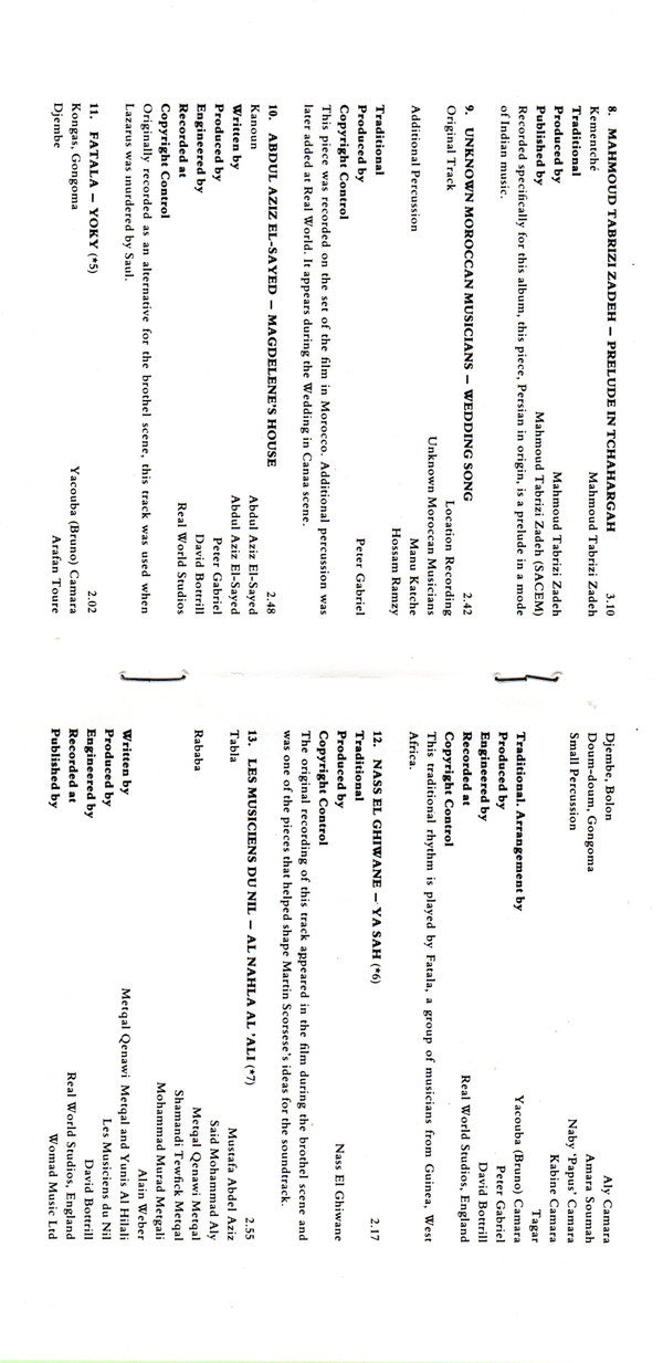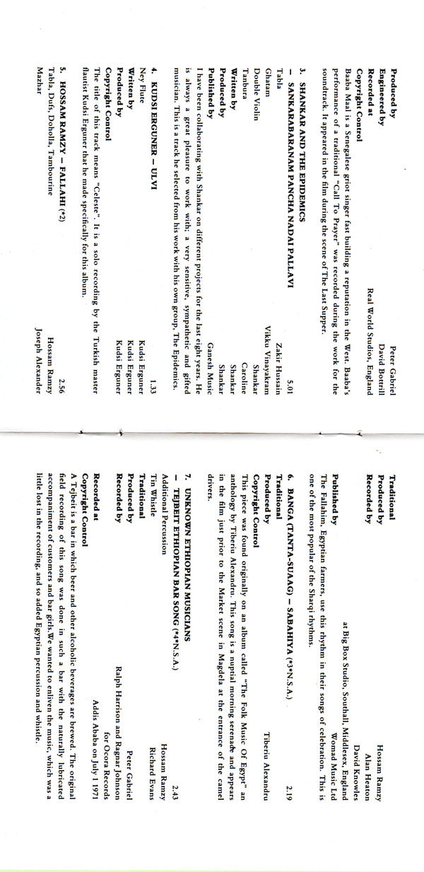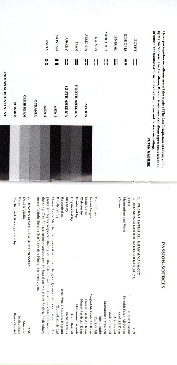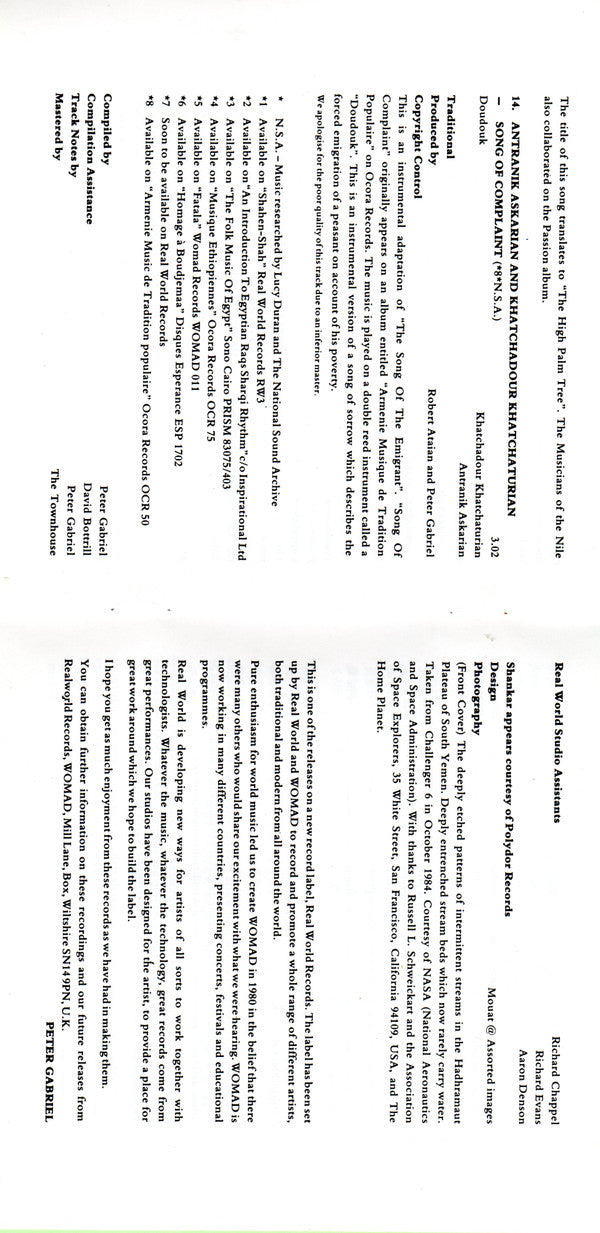 "I have put together two albums around the music of The Last Temptation Of Christ, a film by Martin Scorsese. The first album, Passion, is my work; this album represents a selection of some of the traditional music, sources of inspiration and location recordings." (Peter Gabriel)