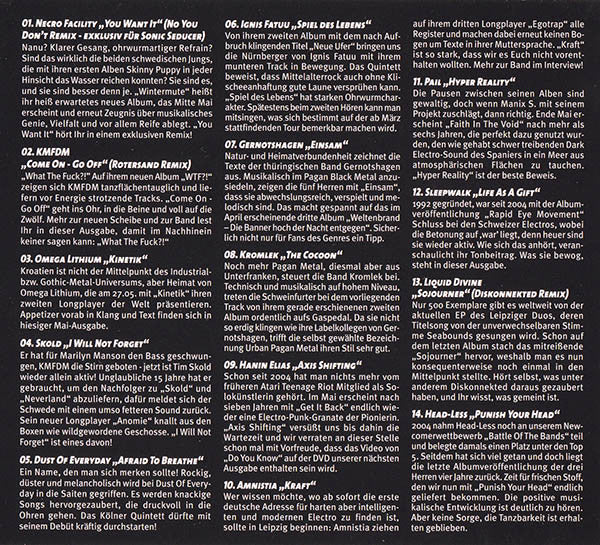 This release is one of two CDs packaged with Sonic Seducer Vol. May 2011. It is housed in a gatefold, cardstock sleeve.